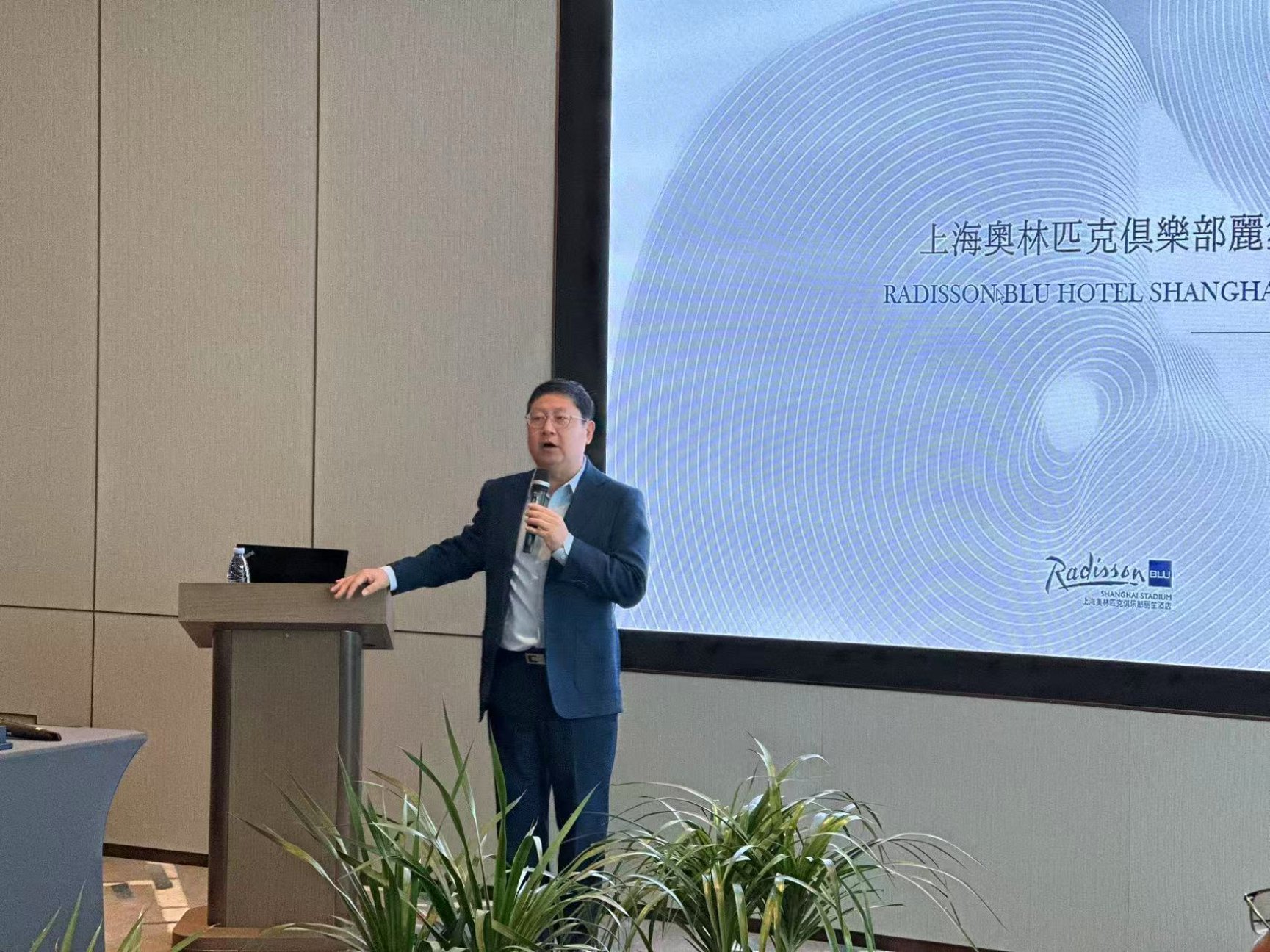 参观结束后,上海奥林匹克俱乐部丽笙酒店业主副总经理徐波为学员们带来了精彩的主题分享。他从酒店品牌理念、设计概念展开深入解读,重点阐述了酒店在“文体 + 住宿”融合发展方面的探索与实践——从承接各类文体赛事配套服务,到打造特色文体主题活动,再到联动周边文体资源构建消费场景,为在场学员提供了丰富的跨界运营案例参考。