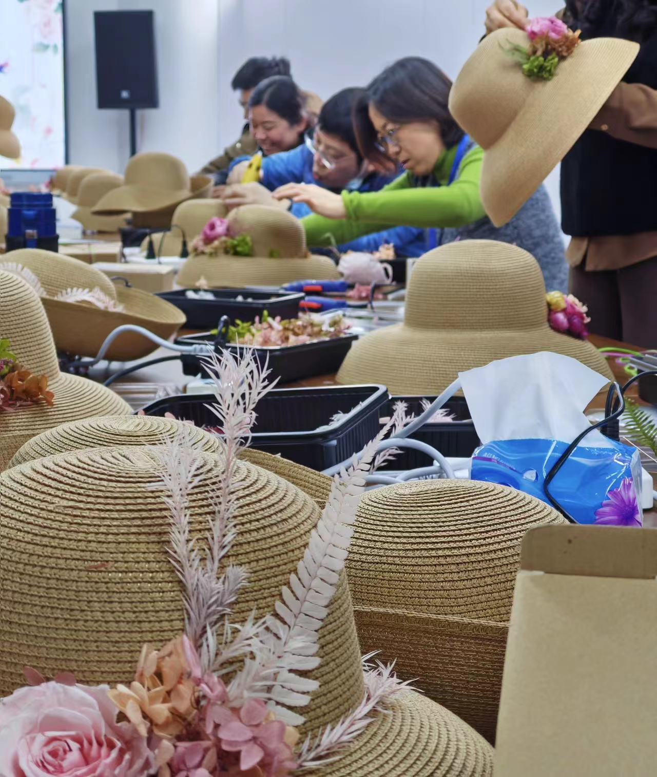 图为永生花礼帽制作现场