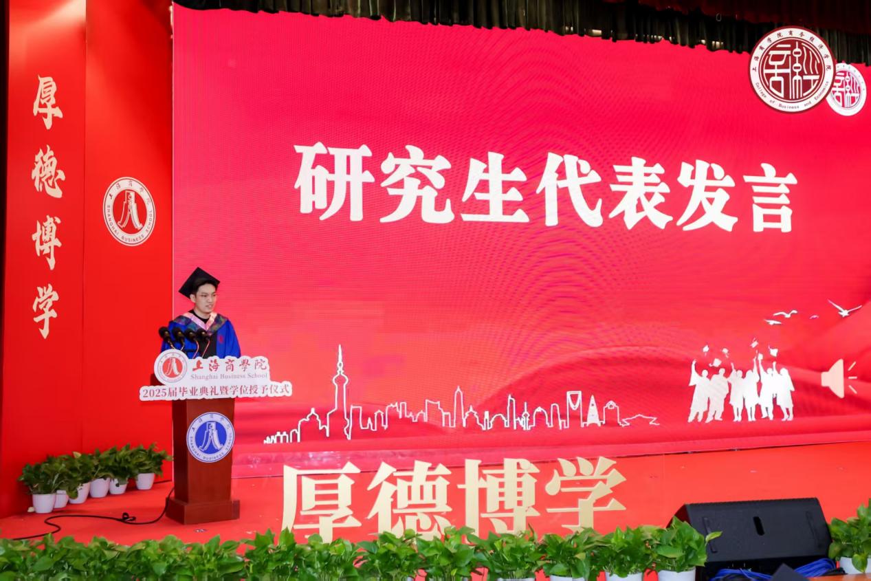 马博康作为硕士毕业生代表发言,他回顾了在上商的求学经历,从初入校园时对学术的懵懂探索到在导师悉心指导下不断钻研,攻克了一个又一个学术难题。同时,他也真挚地表达了对学校、老师和同学的感激之情,并表示未来将带着母校赋予的知识与力量,在各自的领域中奋勇拼搏,为社会发展贡献力量。