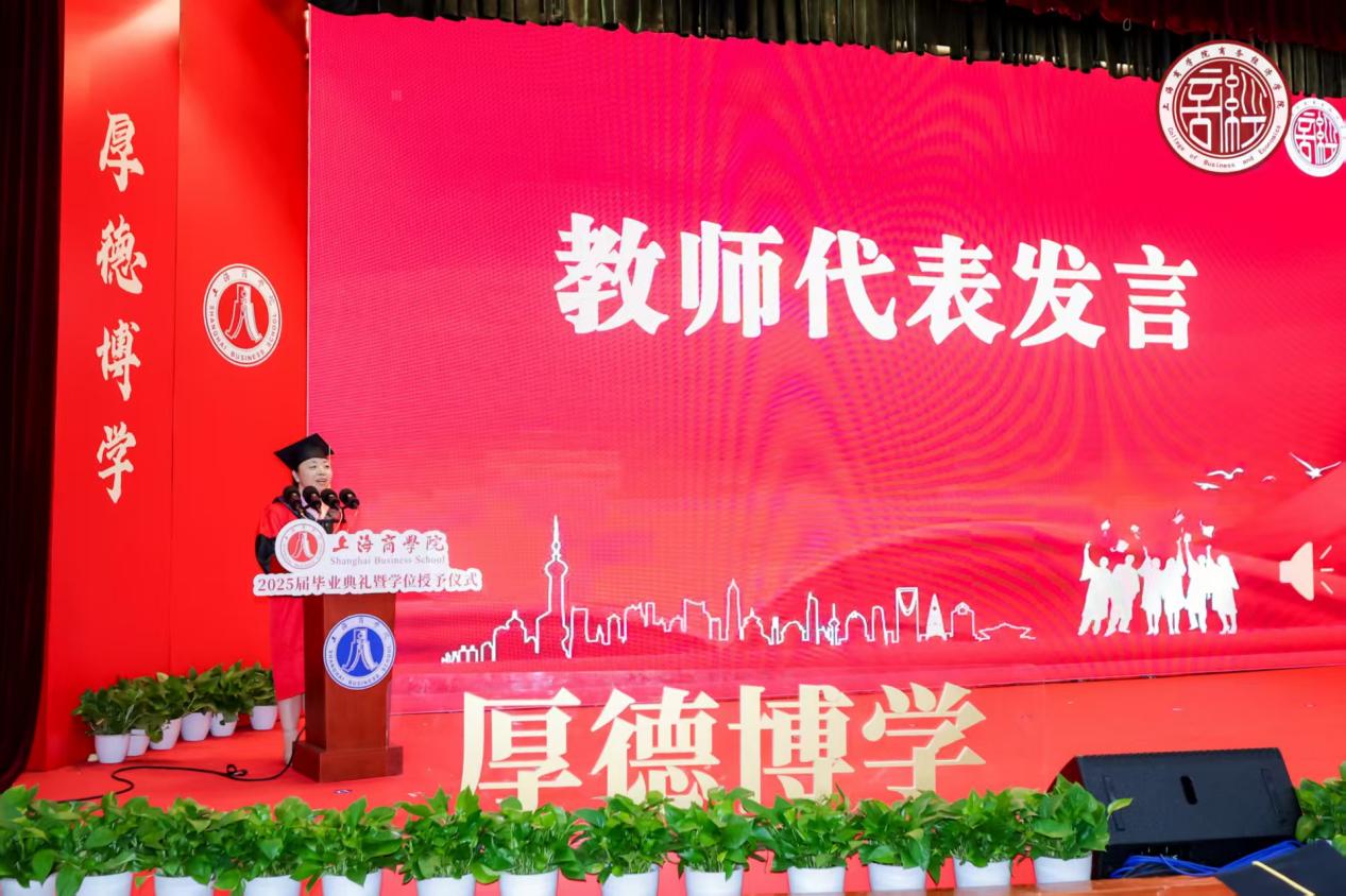 教师代表侯文平老师为毕业生们送上祝福,希望同学们能够秉持理想,行稳致远,养成终身学习的好习惯以应对瞬息万变的时代,在未来的生活中勇担责任,用实际行动践行“知行合一,商通天下”的精神。