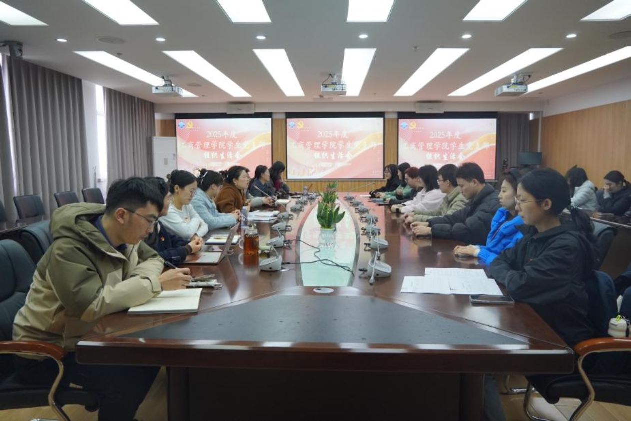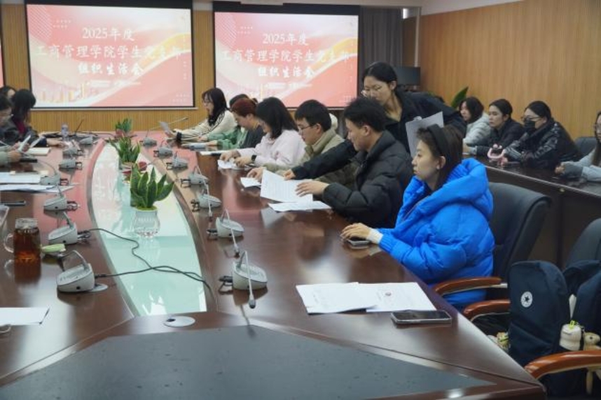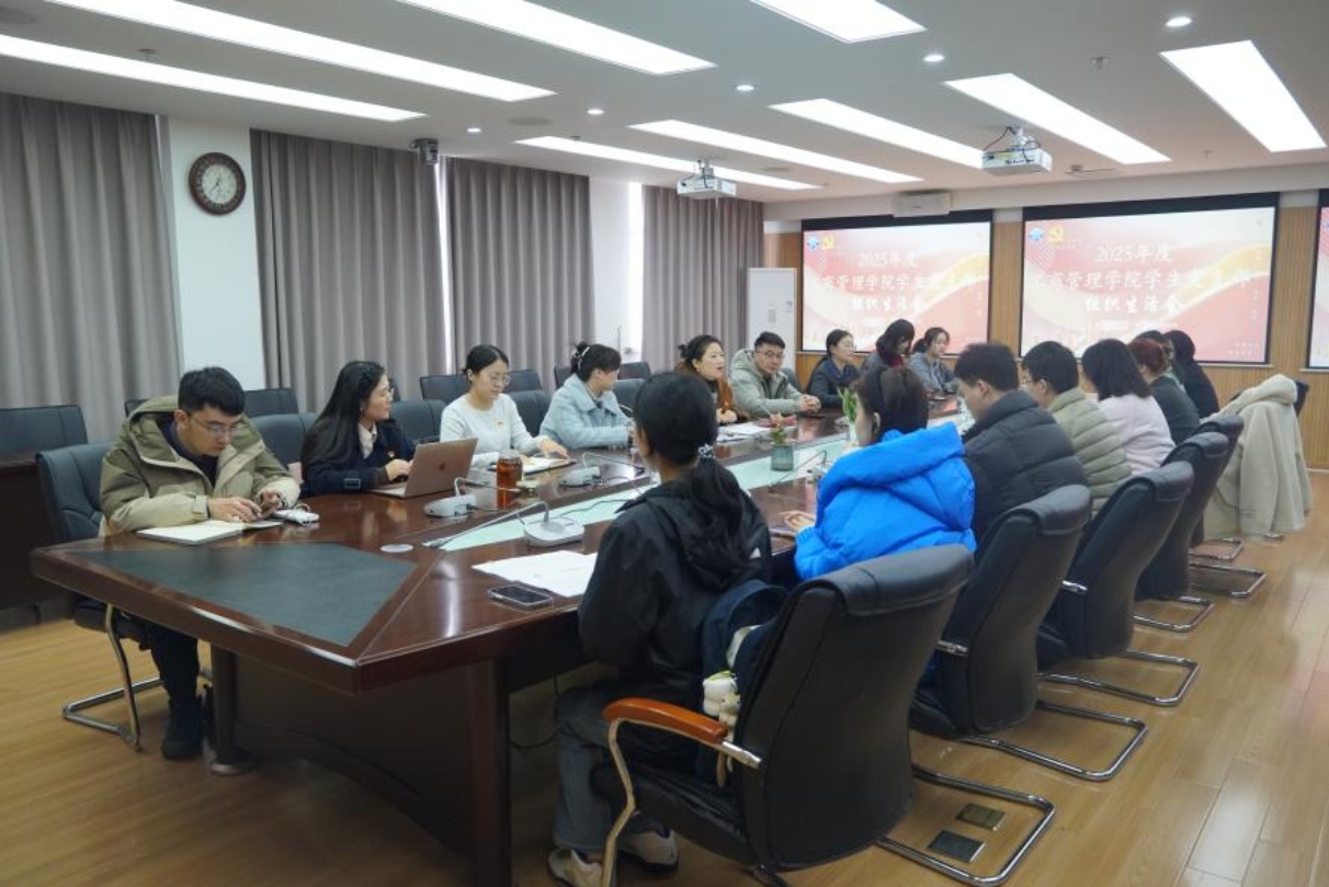 为进一步加强党支部建设,严肃党内政治生活,锤炼党员党性,提升基层党组织的凝聚力和战斗力,工商管理学院学生党支部于2026年3月24日下午,召开2025年度组织生活会,并同步开展民主评议党员工作,工商管理学院学生党支部书记李俊主持会议,支部共8位教师党员,8位学生党员和12位预备党员与会,工商管理学院院长曹静到会指导。