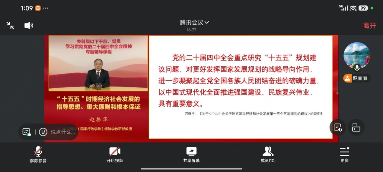 在学习党的二十届四中全会相关精神环节,党支部书记赵丽丽以《学习贯彻党的二十届四中全会精神培训》为主题介绍此次政治学习的重要意义和具体要求。之后,党员老师在线学习观看由中央党校(国家行政学院)经济学教研部赵振华教授主讲《乡科级以下干部、党员学习贯彻党的二十届四中全会精神专题辅导课程》之《“十五五”时期经济社会发展的指导思想、重大原则和根本保证》视频,主要包括制定“十五五”规划的重要意义和《建议》的基本结构、“十五五”时期是基本实现社会主义现代化的关键时期、“十五五”时期经济社会发展的指导方针和主要目标等内容。各位党员老师认真学习聆听,并随后交流发言。王松茂教授把党的二十届四中全会精神、国家战略与科研工作结合起来,如促进消费共同富裕、乡村振兴、防止返贫等具体科研着力点,史文天老师结合中国入境旅游便利度与国际化水平提升、支付便利化、旅游形象推广以及具体专业实习工作等方面谈了学习体会,钟伟老师则主要结合酒店管理行业转型与专业建设等特点,重点交流落实党的二十届四中全会精神的具体做法,如利用AI技术赋能课堂建设等,卢道典老师也结合“两会”中人大代表、政协委员的文旅相关提案、建议,交流了科技赋能旅游强国建设的学习体会。