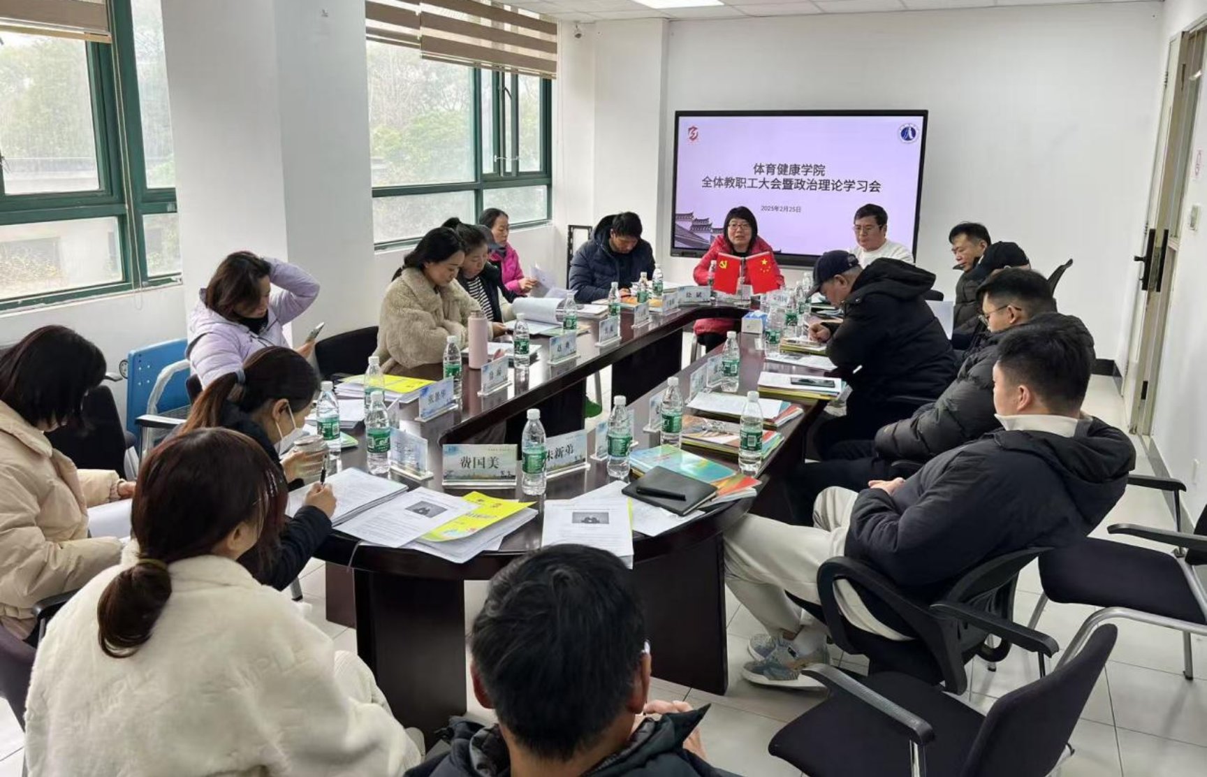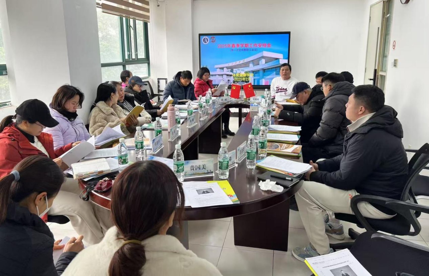 2月25日,体育健康学院2025年春季学期第一次全体教职工大会在行政楼219会议室召开。会议由学院党总支副书记费黎艳主持,院长荣敦国对本学期重点工作作了重要部署,副院长徐斌安排了具体教学工作,全体教职工参会。