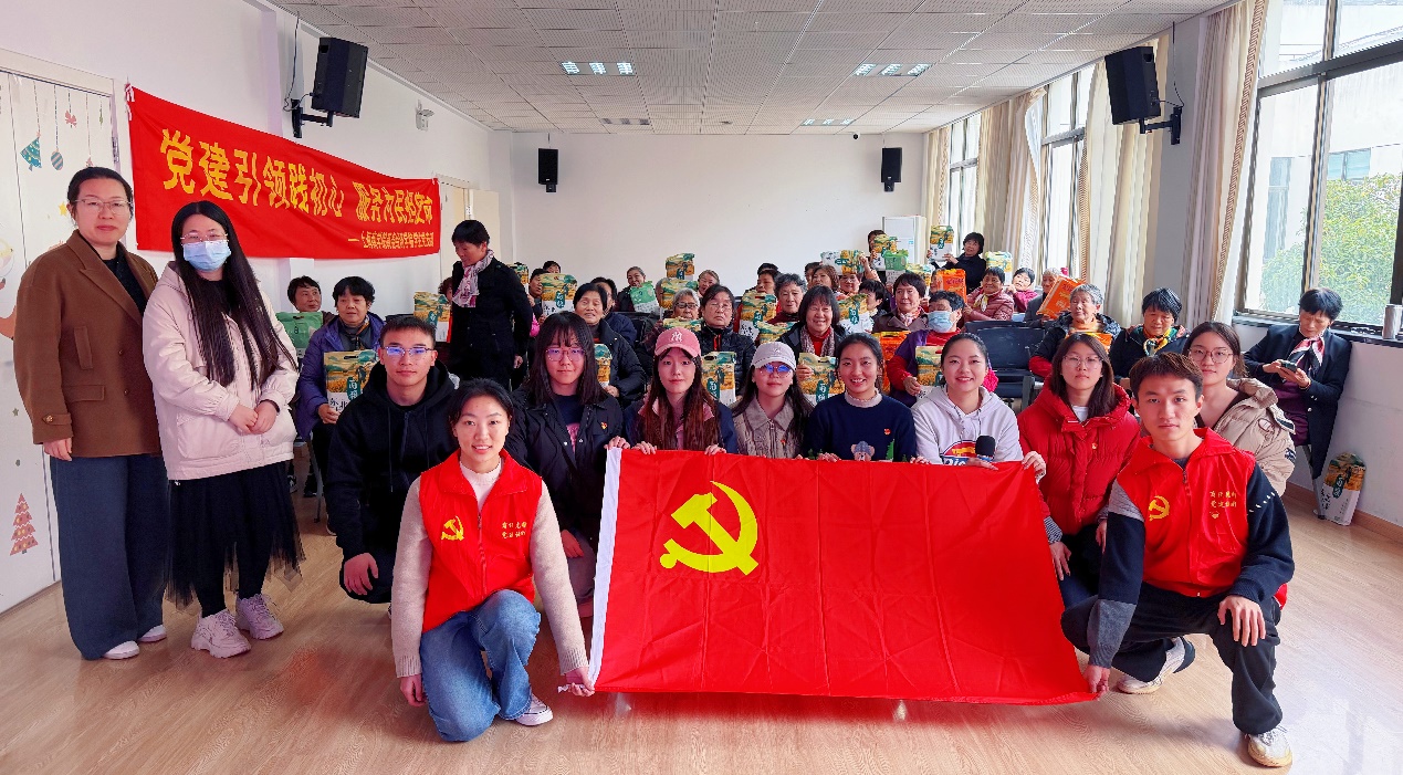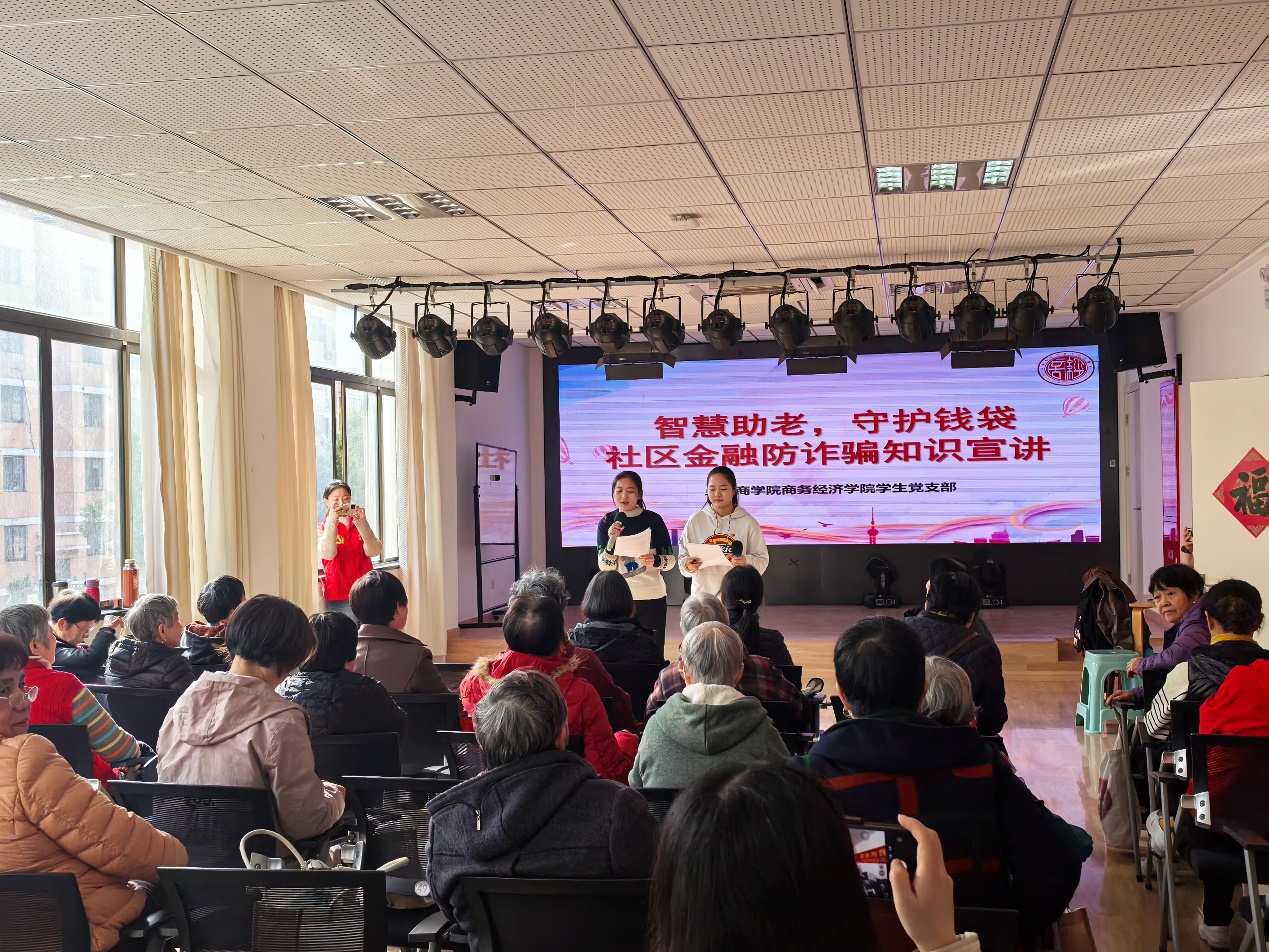 理论的价值在于指导实践。“商经·先锋”党建社牢牢把握习近平经济思想“以人民为中心”的发展理念,将理论学习成果转化为服务群众的具体行动。2025年12月12日,商务经济学院学生党支部和“商经·先锋”党建社走进奉浦街道国顺路综合为老服务中心,开展“智慧助老,守护钱袋”金融防诈骗知识宣讲活动。