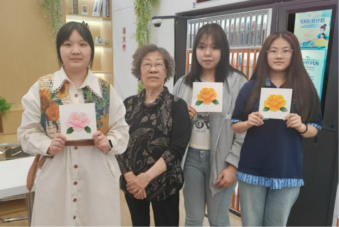 非遗工坊的本科生赵青、彭佳欣、孙锦雯同学参与了“杨浦非遗进商圈”之布艺画牡丹活动。上海市杨浦区非遗项目海派布艺画第四代传承人孟新民老师亲临现场,孟老师从唐代堆绣技艺讲起,指导同学们以绸缎剪裁、粘贴创作牡丹主题布艺画。在孟老师的指导下,大家亲手制作布艺画,拼接出牡丹花的娇艳与盛开之姿。通过布艺画这一传统工艺,学生们将春色凝固于画布之上,深刻体会到了非遗文化的独特魅力与深厚底蕴。同学们感慨:“每一针一线都凝聚着匠人对自然的敬畏,非遗不仅是技艺,更是文化自信的根基。”
