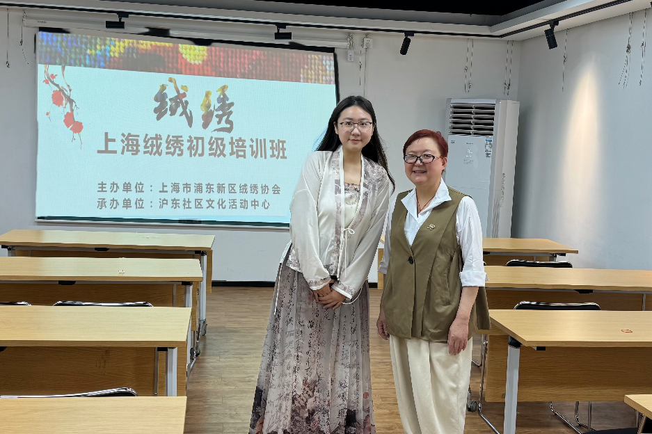 杨林同学(左)与国家级非遗上海绒绣传承人王丽萍老师(右)合影