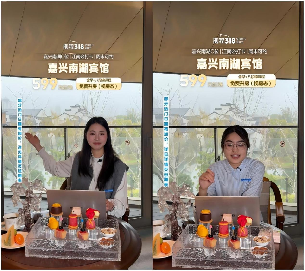 线上实战的亮眼表现,让学子迎来更高规格的行业实践机会。酒店管理专业学生姜羽柔、汪家依受邀奔赴嘉兴、安吉两大旅游目的地,参与携程实地直播项目。在携程行业导师的专业指导下,两名学子深度参与场景踩点、话术设计、现场直播等各个环节,直面真实市场需求与直播突发状况,在沉浸式的实战体验中,进一步锤炼了场景化表达、临场应变及产品整合推广能力,使学生直播专业素养实现全方位提升。
