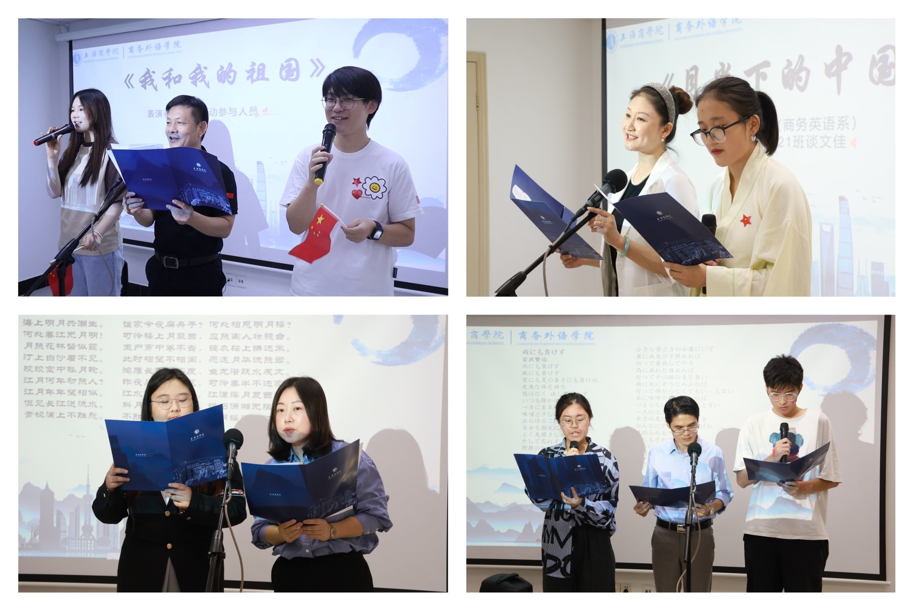 商务英语系教师尚华和商务英语221班谈文佳用中英双语诵读《月光下的中国》,仿佛让我们看见那一轮柔美的明月见证着国家和民族的发展历程,抒发了朗诵者发自内心的自豪与感激之情。一曲琵琶合奏的经典乐曲《我的祖国》,让现场师生在悠扬的旋律中回味中外师生的精彩表演,在歌声中共同感受对祖国的热爱之情。多语经典诵读活动在现场师生齐声合唱《我和我的祖国》中缓缓落下帷幕。歌声嘹亮,饱含着师生们对祖国深深的热爱与祝福,以团结友爱的姿态向祖国七十五华诞献上了一份特殊的礼物。
