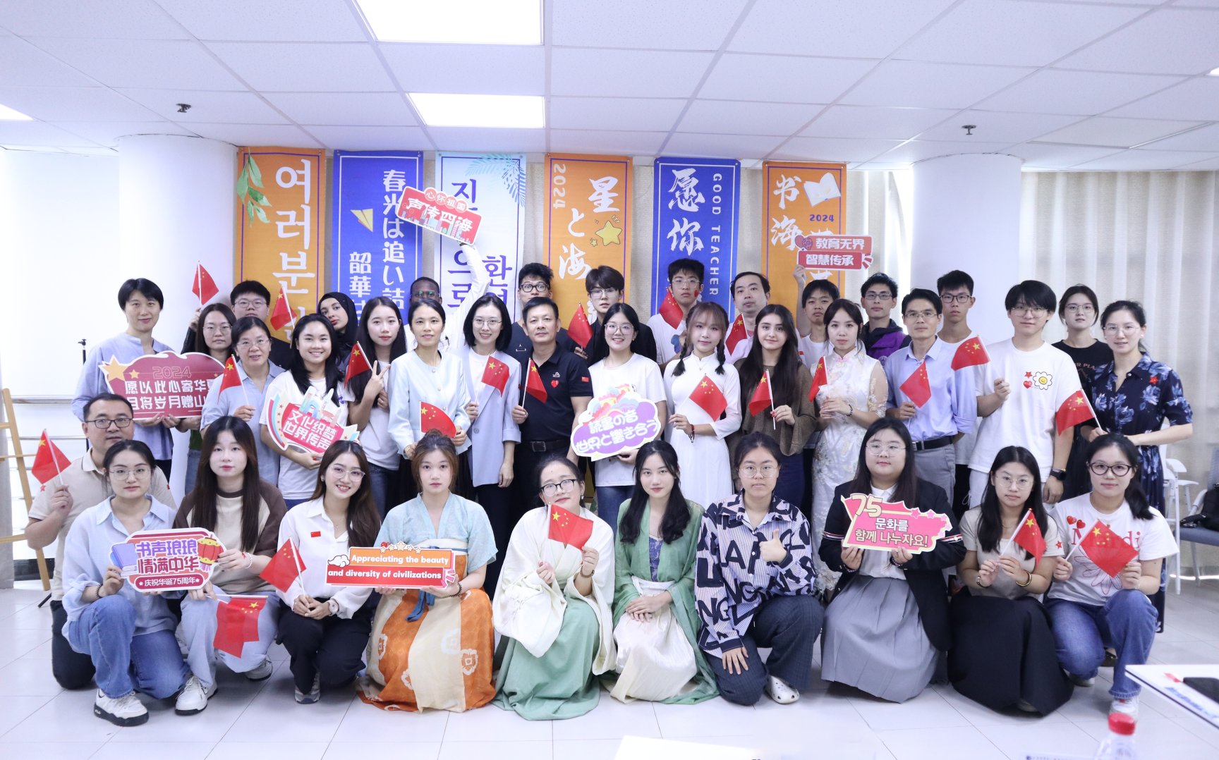 今年恰逢新中国成立75周年,中外师生们以集体诵读融入舞台短剧、民乐表演、集体合唱等形式,一同品味那些铭刻在历史长河中的中华文化瑰宝,感受其跨越时空的魅力与力量。