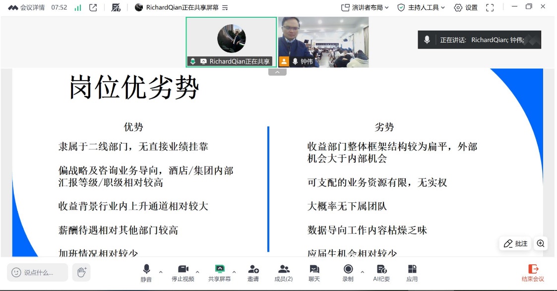 作为深耕酒店收益及营销管理领域的资深专家,钱忱忻先生拥有近十年的丰富从业经历。他曾先后任职于雅高大中华区总部、华住集团科技子公司盟广信息、希尔顿亚太区收益管理整合中心以及华住集团营销支持中心,历任收益分析员、售前方案经理、区域收益经理等关键岗位。此次分享,他结合自身职业发展路径,从行业历史、工作实务、组织架构、岗位要求及职业前景等多个维度,为同学们描绘了一幅清晰的行业全景图。