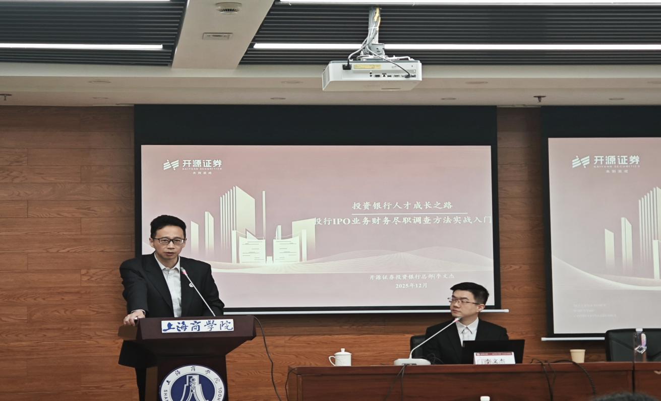 12月8日上午,由商务经济学院主办的“Fin Talk&国际商务精英大讲堂”在中山西路校区1401会议室成功开讲。本期活动以“投资银行人才成长之路:投行IPO业务财务尽职调查方法实战入门”为主题,特邀开源证券投资银行业务总部团队负责人、执行董事李文杰先生担任主讲嘉宾。李文杰先生拥有超过14年的投资银行与会计师事务所复合经验,是高级管理会计师、香港注册会计师,并曾借调证监会参与IPO现场检查。本期讲座由商务经济学院院长李志刚教授主持,学院国际商务和金融专业研究生积极参与。