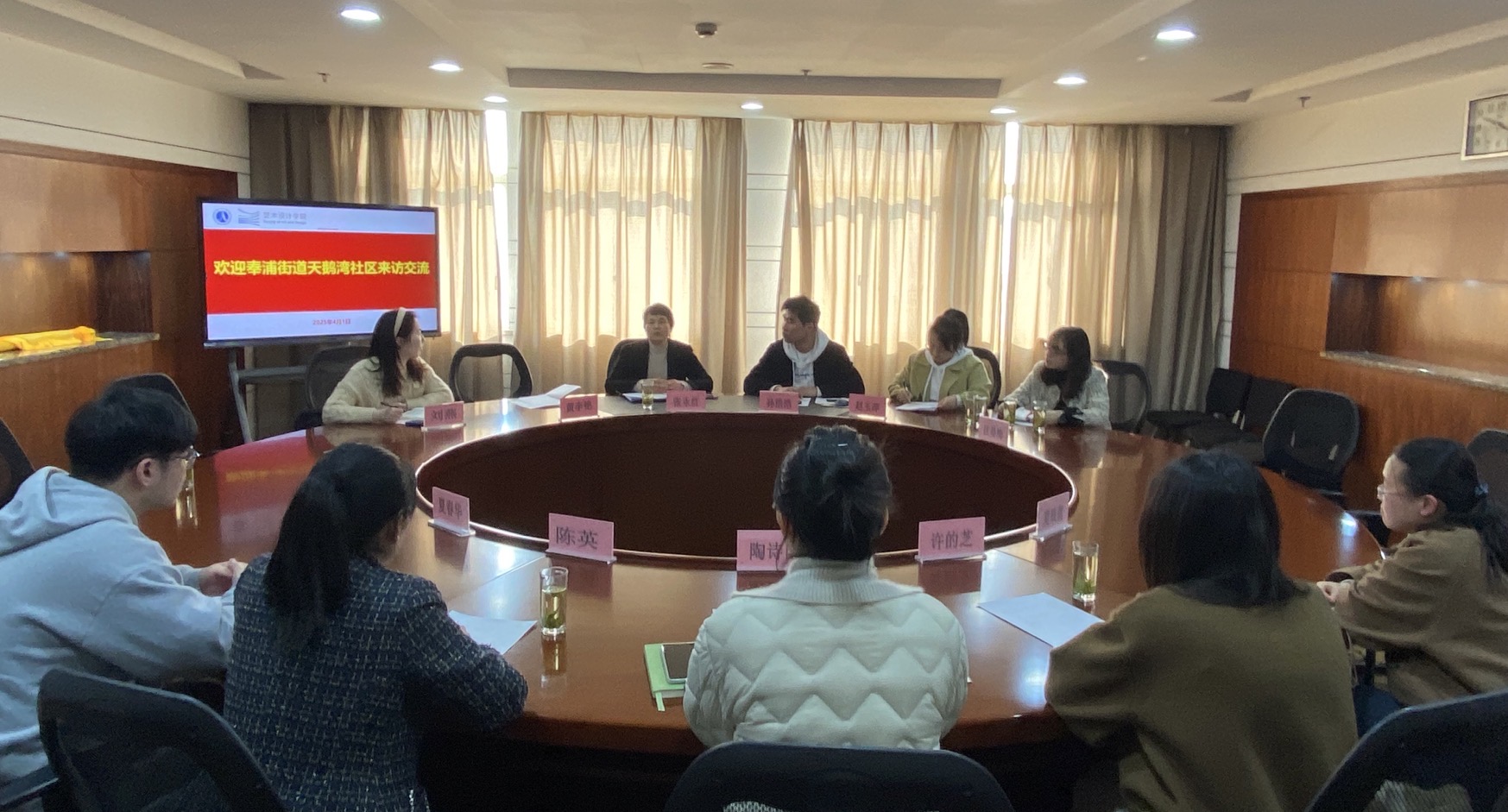 2025年4月1日,奉浦街道团工委副书记陶诗雨、天鹅湾居委党支部书记、居委会主任陈英一行来访艺术设计学院开展党建工作研讨交流活动,并向学院学生党支部赠送锦旗。学院党总支书记张永红、学生党支部书记、支委、专职组织员、分团委书记参加会议。