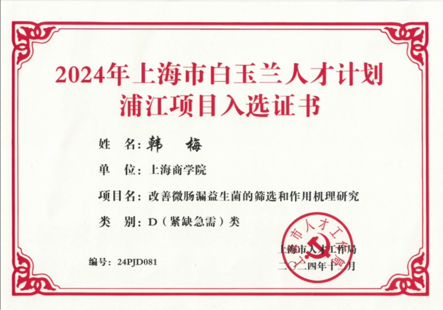 韩梅老师入选上海市白玉兰人才计划浦江项目