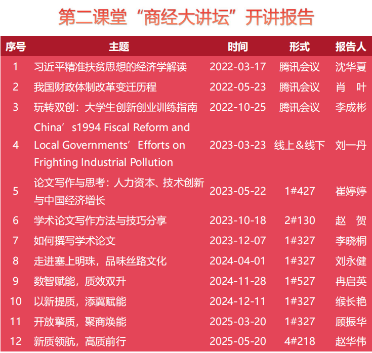 打通一二课堂,精研课程思政主脉络。打造思政育人品牌“商经大讲坛”,聚焦脱贫攻坚、新质生产力等主题开展十余场,引领学生将学习实践融入时代大潮。多个团队和学生在“中国国际大学生创新大赛”市赛等高水平竞赛中屡获一、二、三等奖。