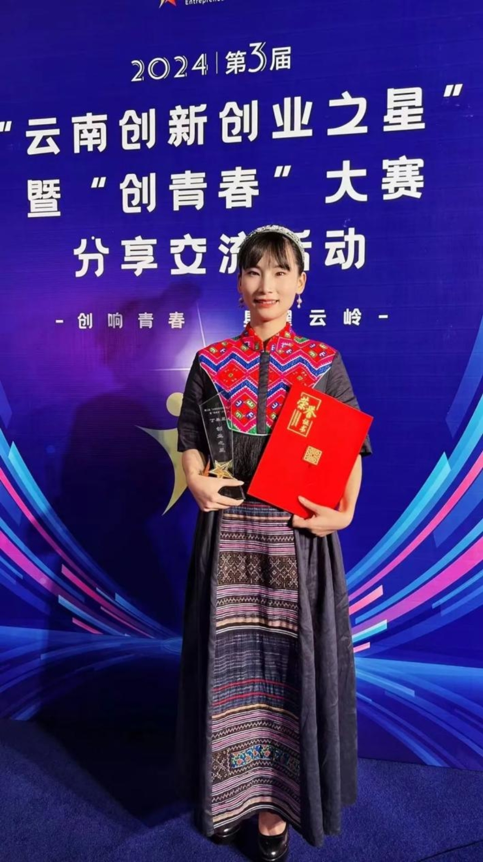 图为丁美星参加2024年第3届“云南创新创业之星”暨“创青春”大赛省级“创业之星”获奖照片