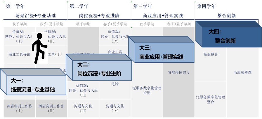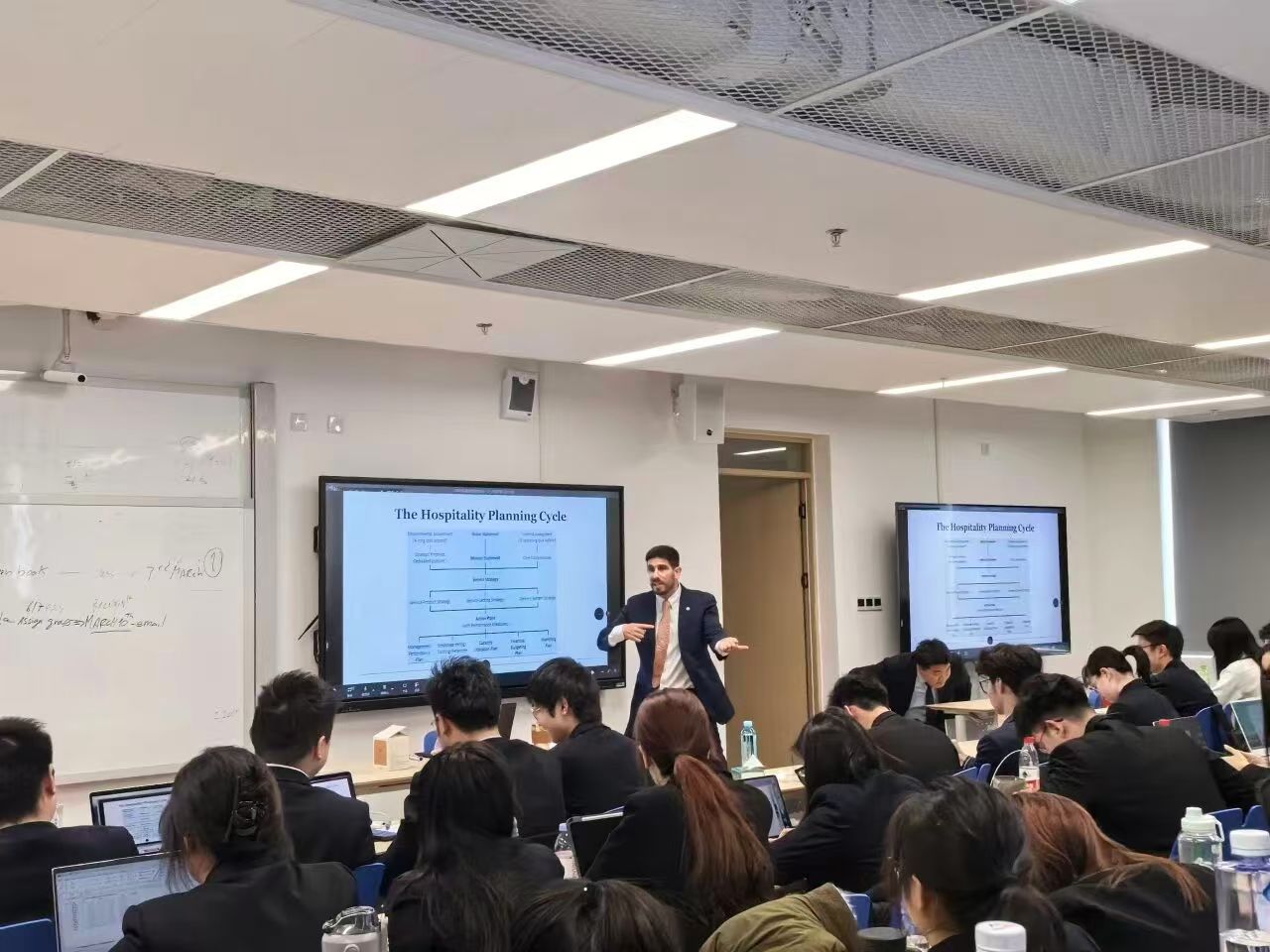 坚持理实结合,构建阶梯路径。学院坚持理论实践结合,以模块化、进阶式、重实践,构建阶梯式培养路径:从场景实践+专业基础(第一学年),到岗位沉浸+专业进阶(第二学年),再到商业应用+管理实践(第三学年),最后学年进行商业整合创新课程和项目,形成“先做后学、学做互证”的螺旋上升培养模式。同时,学院定期举办LAMP讲座,邀请国际知名酒店集团高管、行业专家来校分享最新行业趋势与管理经验,以学科前沿知识提升培养质量。