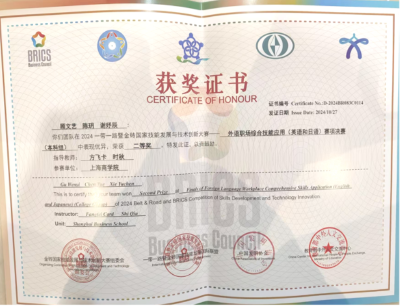 图为2024“一带一路”暨金砖国家技能发展与技术创新大赛获奖证书